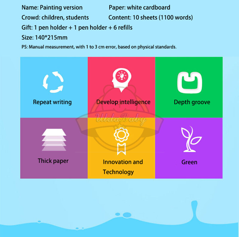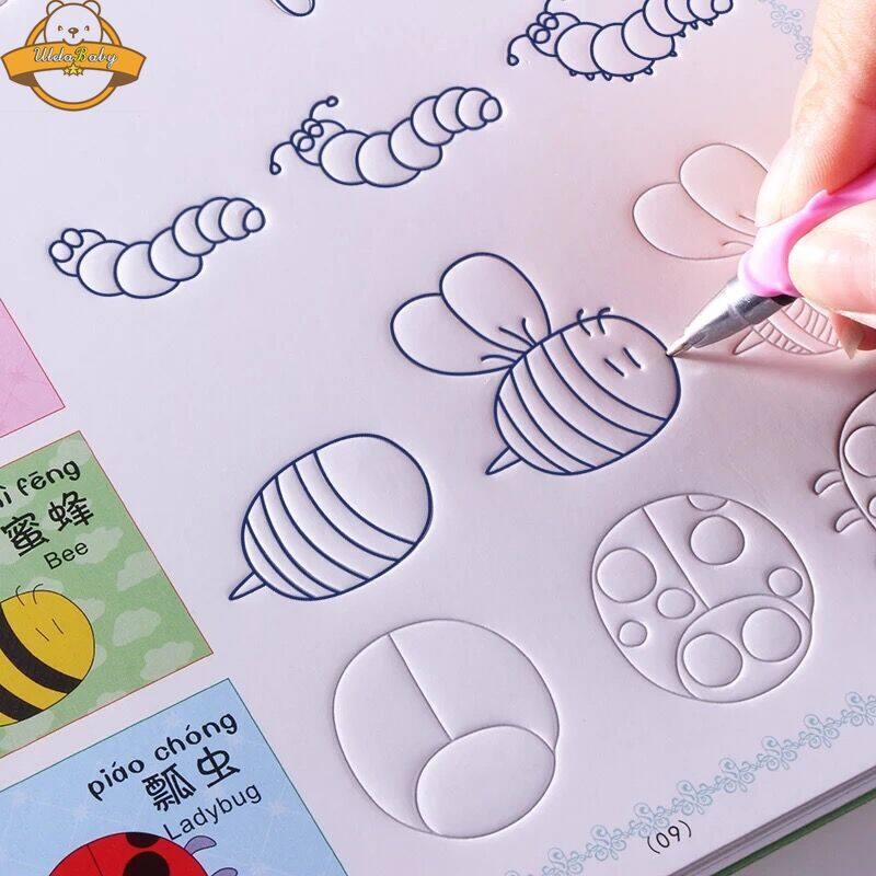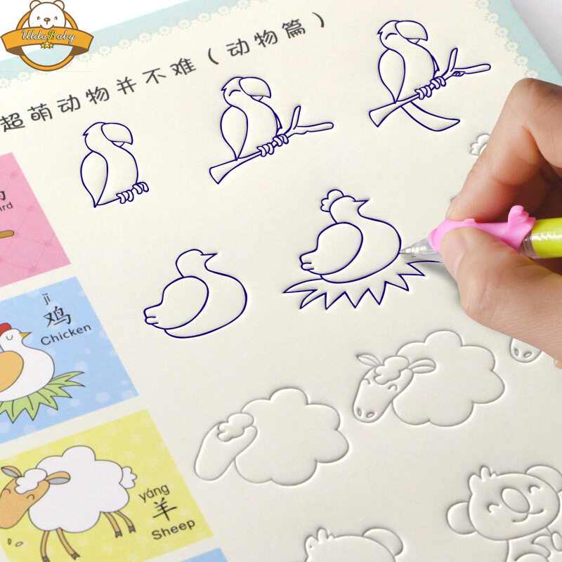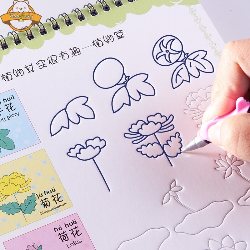 UlelaBaby Reusable Calligraphy Practice 3D Drawing Book Groove Animal /Fruit / Vegetable / Plant Cartoon Children Coloring Books Kids Painting Book for 3-8 Years