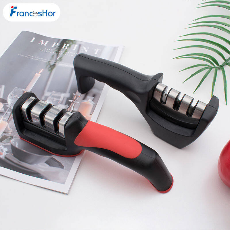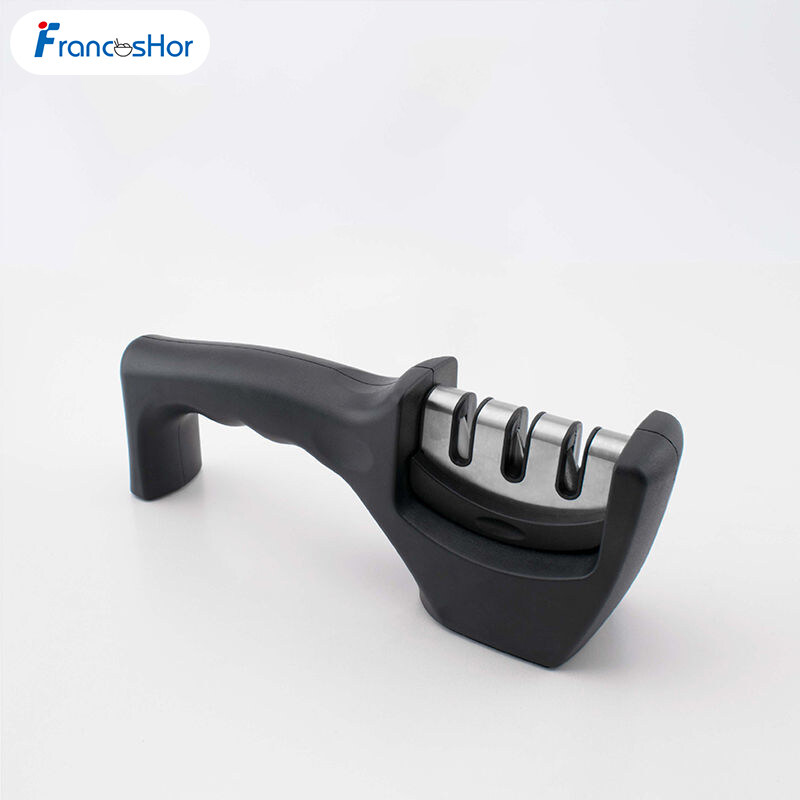 3 STAGE MANUAL SHARPENER - for Brilliant Results every time. Prepare, Sharpen, then Hone. Quickly and effectively keeps your kitchen knives brilliantly sharps and restores blunt knives back to their former sharpness.ERGONOMIC DESIGN - the Sharpener features a comfort handle for maximum grip, suitable for both right and left-handed users. Heavy duty non-slip rubber base for stability & safety - any flat surface in your kitchen will do (no need to find a suitable clean surface, unlike sharpeners with suction cup designs).FOR USE ON: straight edged steel kitchen knives and wide serrated knives (bread knives), including knives with hardened steel blades. DO NOT USE ON: ceramic knives, scissors or micro serrated knives.