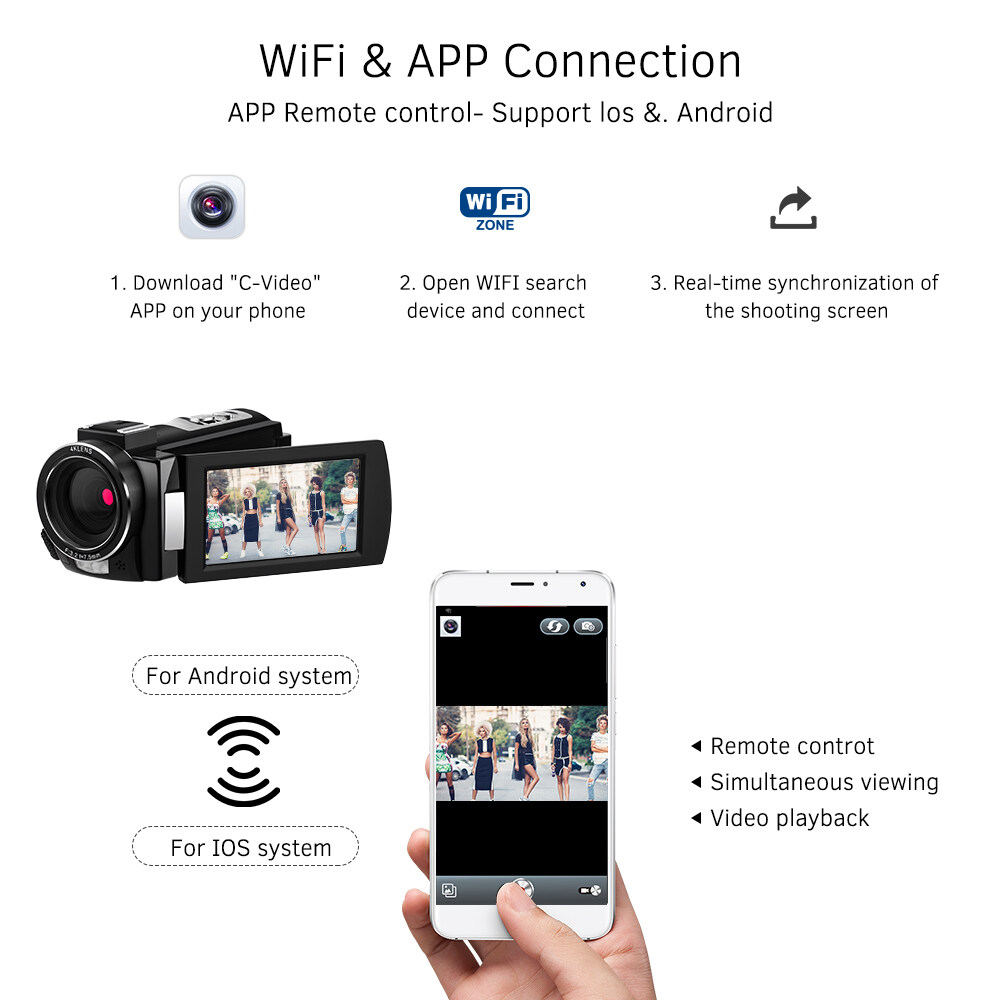 WiFi, video and photo can be controlled and shared by downloading APP "C-Video" on smartphone; Hot shoe mount for connecting external microphone or