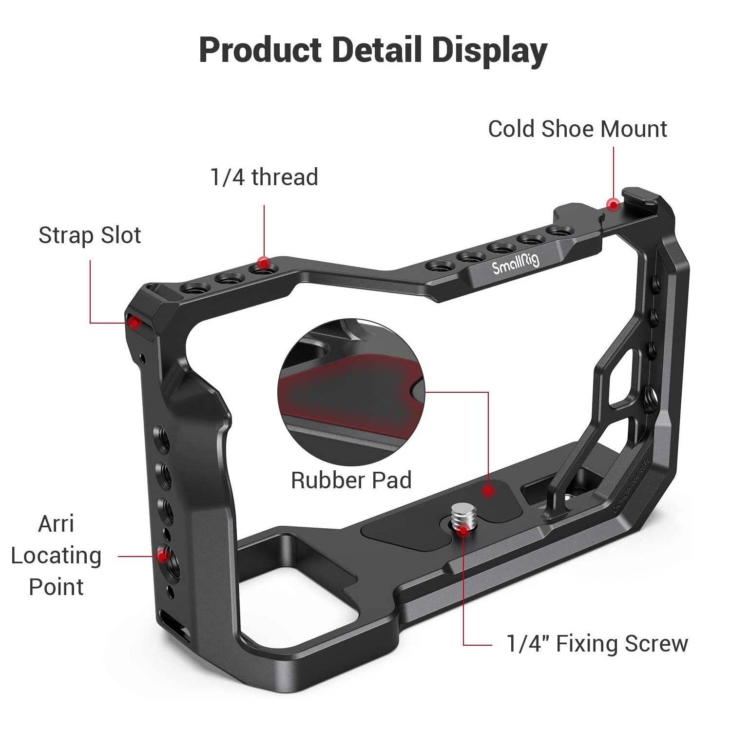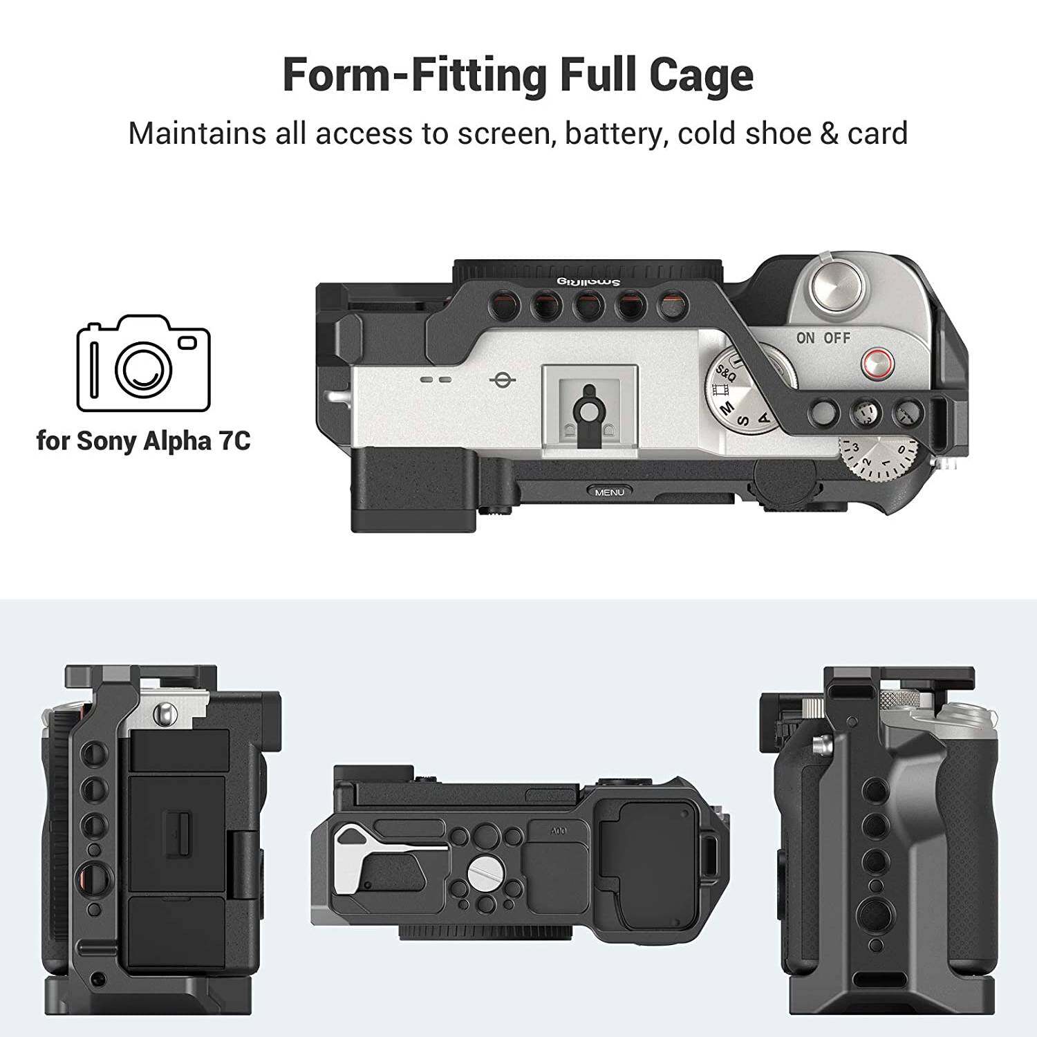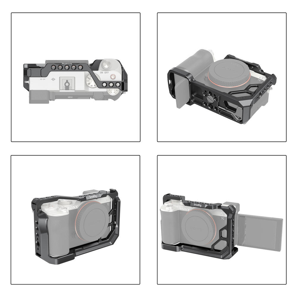 SmallRig Cage for Sony A7C 3081 is a form-fitting full cage specifically designed for Sony A7C. It is lightweight and compact. To maximize the mounting options, the cage can be seamlessly integrated to the camera and features multiple 1/4”-16, 3/8”-20, ARRI thresholds, and cold shoe, which enable filmmakers to set the whole rig up within the compact body of the cage. With a built-in Arca-Swiss quick release system, the cage allows the fast switch between tripod shooting, handheld shooting, and gimbal shooting. The cage secures the camera via a 1/4”-20 screw on the bottom and an m2.5 screw on the right side to further prevent twisting. Additionally, the lightweight and ergonomic design are able to boost the grip experience to the greatest extend.