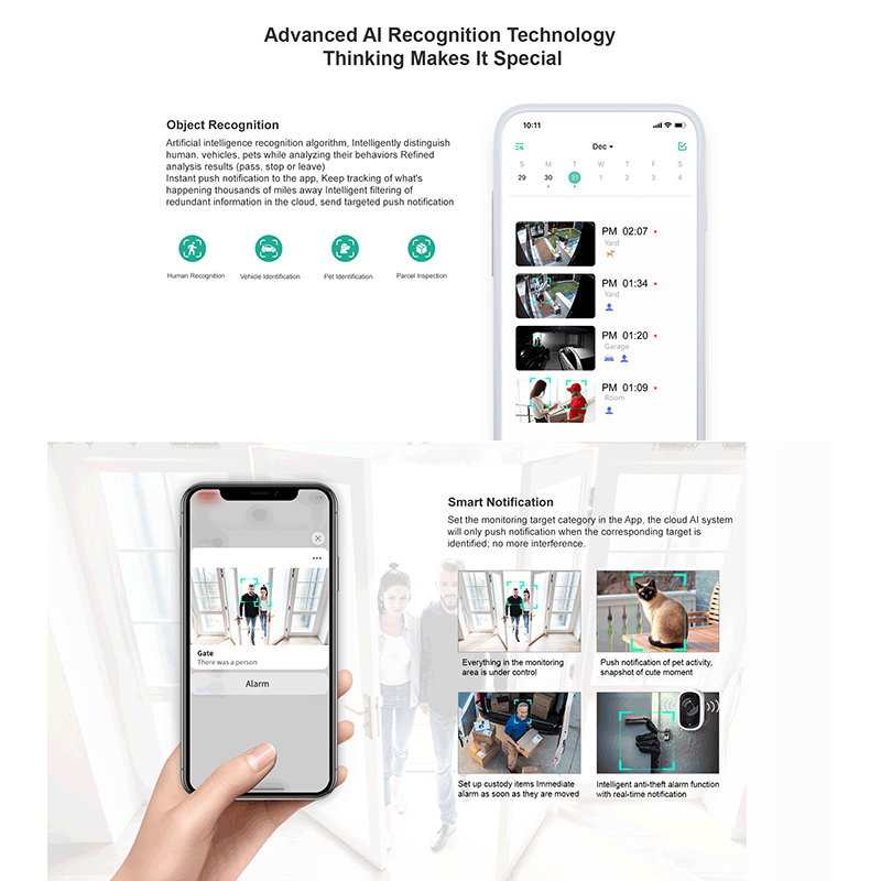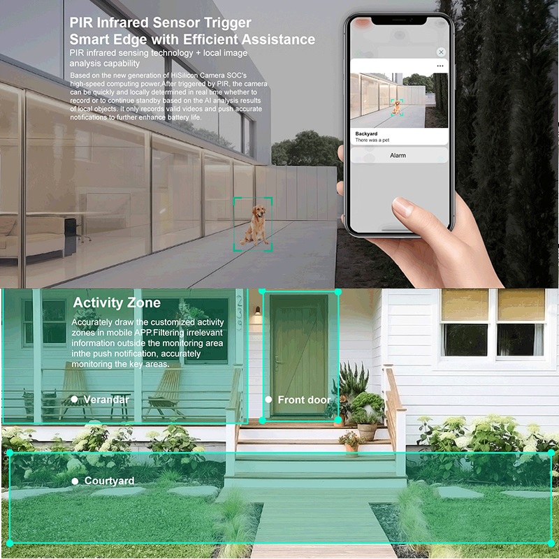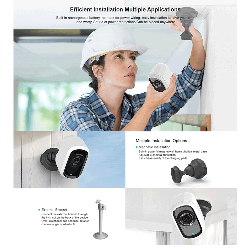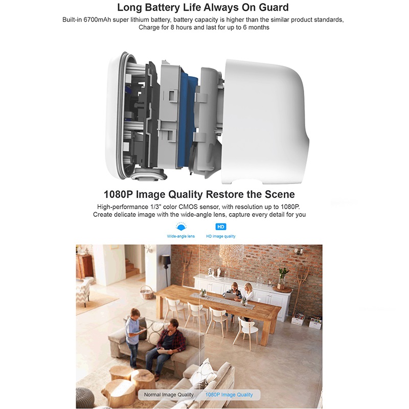 Specification:Sensor:1/3” COMS 2MP image sensorResolution:1920*1080Lens:3.6mmIR LED:8pcsNight vision:10m/33ftSpeaker:Built-inMicrophone:Built-inVideo compression:H.264+Storage:Cloud storage&SD card storage(MAX 128GB,SD card option include)WIFI:2.4GHz only,No support 5GPower:polymer rechargeable battery 5200mahWaterproof:IP66Working temperature:-10℃~55℃