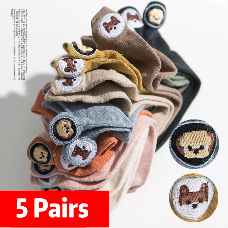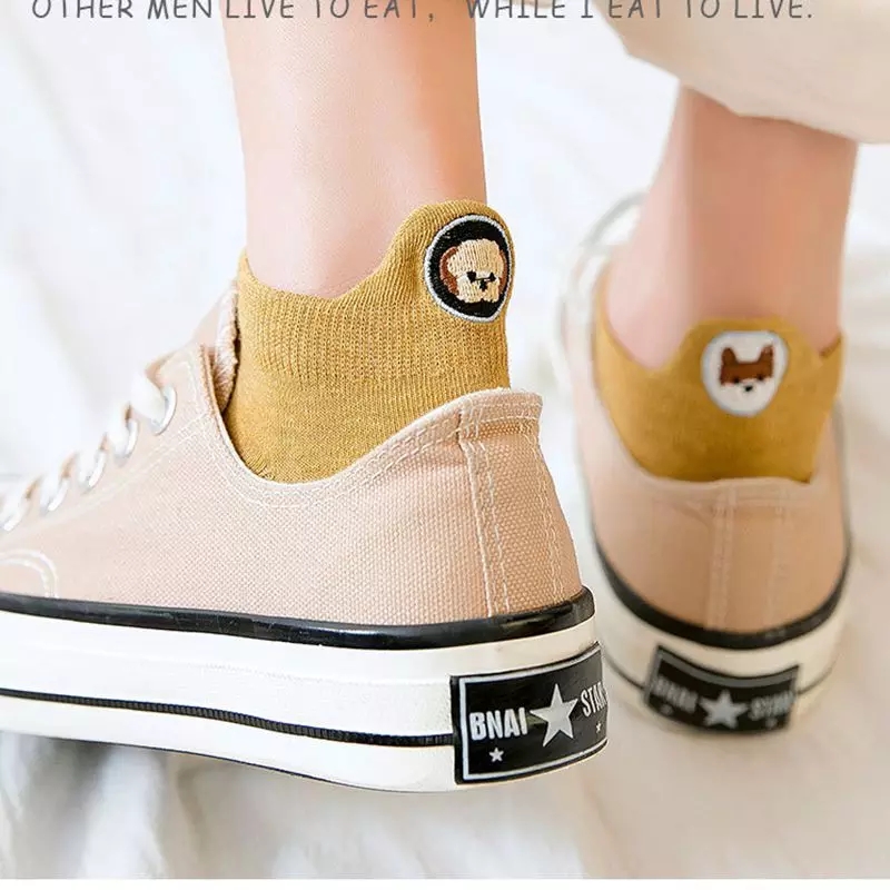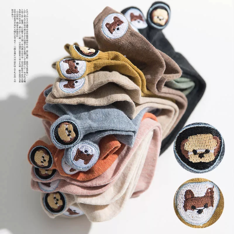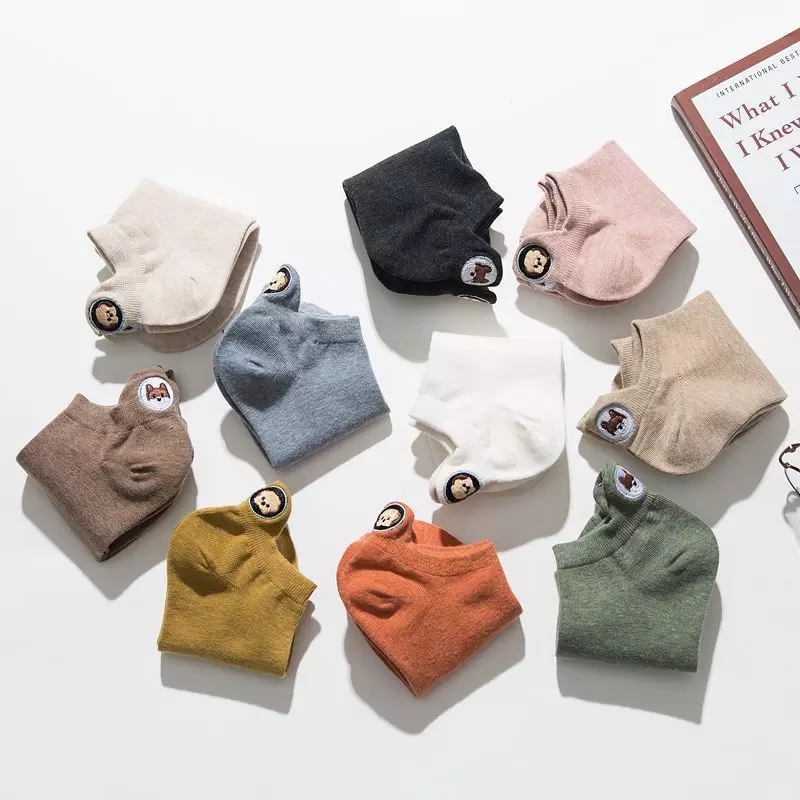 (SG Seller) Women Funny Ankle Socks Embroidered Animal Pug Cute Socks Kawaii Cartoon Candy Color Breathable Cotton Boat Socks