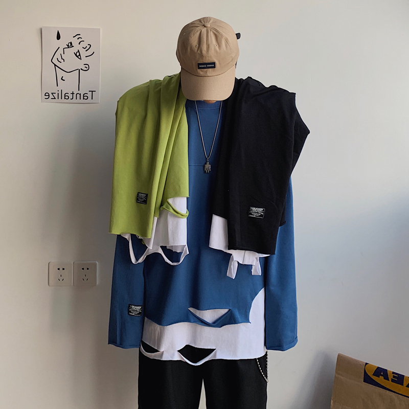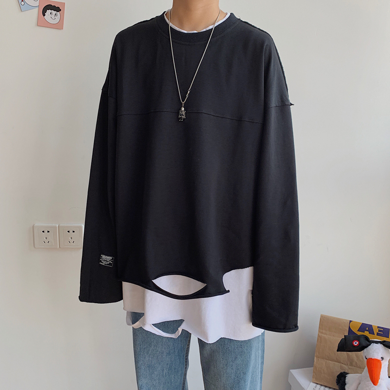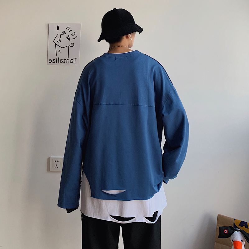 Hong Kong Style Ins Super Hot Fake Two-Piece Sweater Men's Korean-Style Trendy Loose Handsome Personality Ripped Bottoming Shirt Men Harajuku