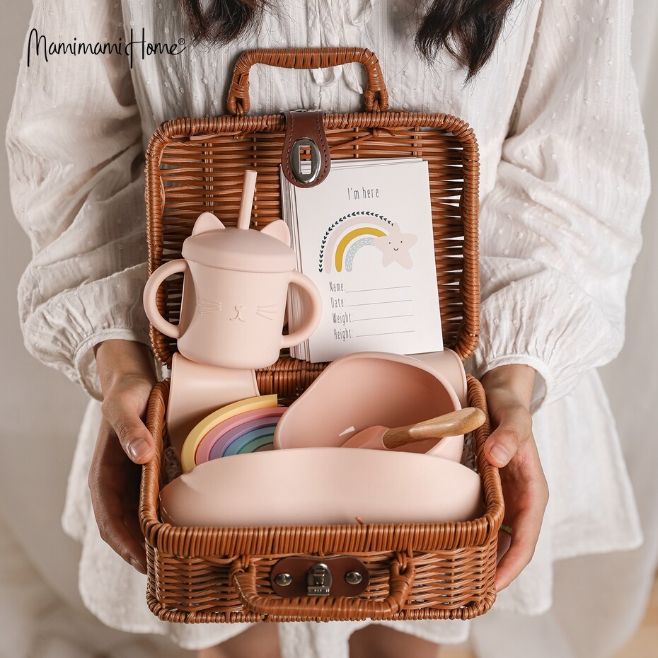 1 x Silicone Bib,1 x Silicone Spoon,1 x Sippy Cup,1 x Silicone Bowl,1 x Silicone Building Block,1 x Rattan Box,16 x Milestone Cards