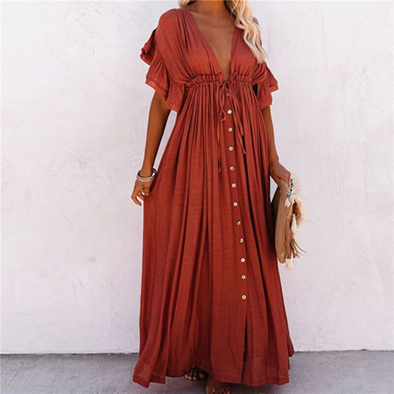 Pick me up ShopWoman Bohemian Boho Fashion Elegant V Neck Bikini Cover-ups Long White Tunic Casual Summer BeachDress Elegant Women BeachWear Swim Suit Cover Up Loose Maxi Pregnant Maternity Dresses Pl