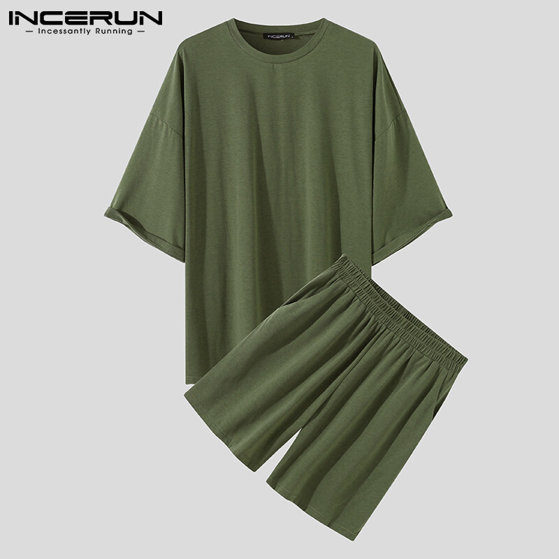 INCERUN Mens Shorty Pajamas Sets Nightwear Japanese Loose Fit Tops Shorts Sleepwear Suit (Korean Style)