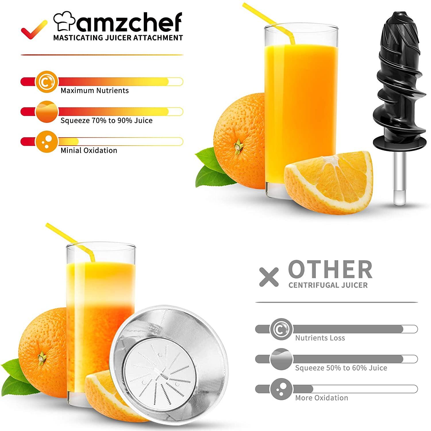 Ideal juicer attachment: With our chewing juicer attachment you can upgrade your mixer to a juice machine. It helps you separate the pomace from the juice easily and extracts the nutrients from the fruits and vegetables into the juice. Enjoy a nutritious and healthy life.Maximum juice volume: Thanks to the 7-segment spiral screw and high-density 304 stainless steel filter, the fruit juice yield can reach 90%. No manual filtering of the pomace and no adding of water as with other juicers. You can enjoy the original taste and aroma.Easy to use: installation and removal can be completed in minutes. Just loosen the attachment button and insert the worm shaft into the hub bushing, then place the cut fruits and vegetables in the feed tube, the blender does all the work.Easy to clean: Wash directly with water, with the equipped brush you can achieve quick cleaning in a few minutes. Please do not put in the dishwasher. This slow juicer accessory is suitable for all Kitchen Aid juicers.