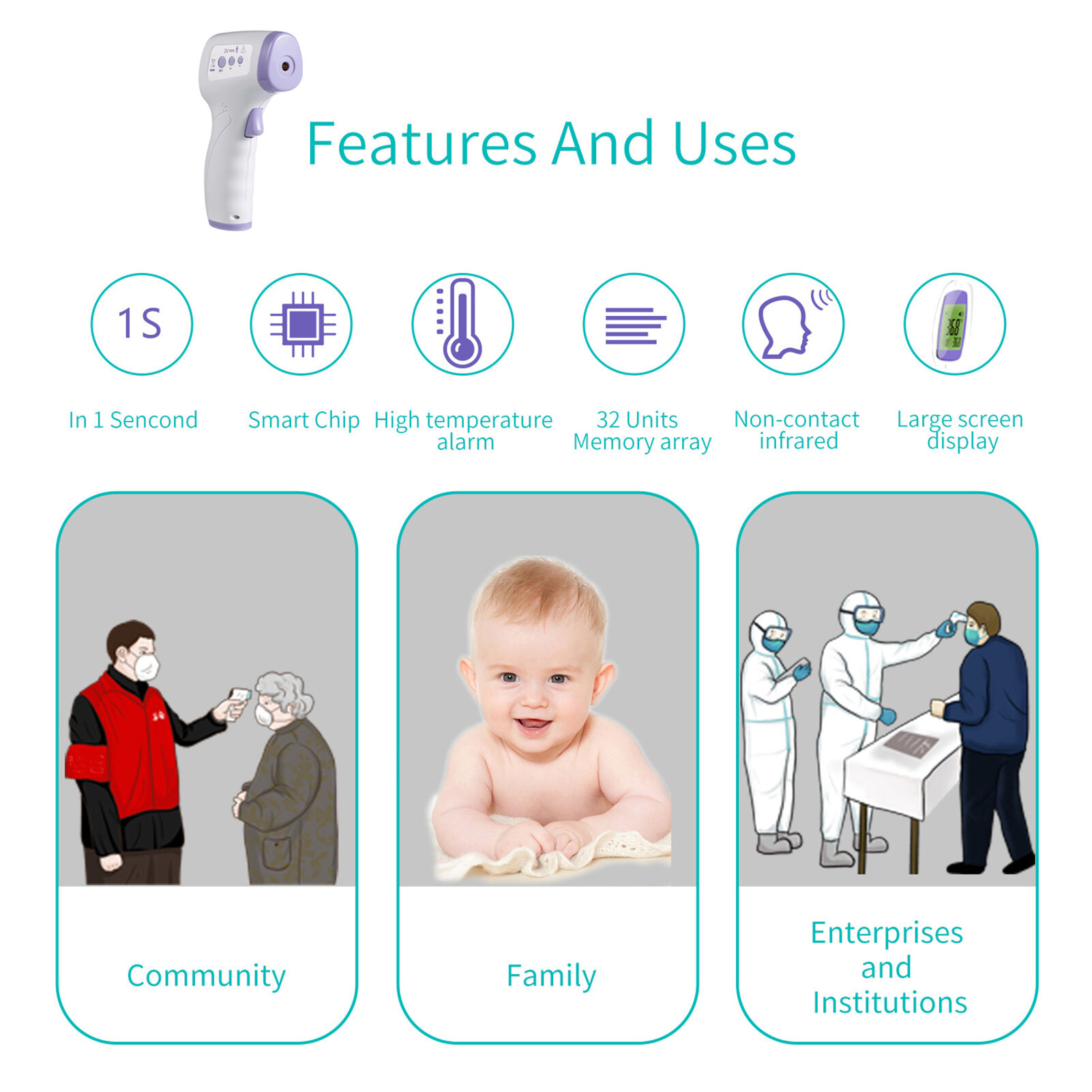 gun. Avoid touch skin, convenient measure your temperature, and no risk for cross infection.