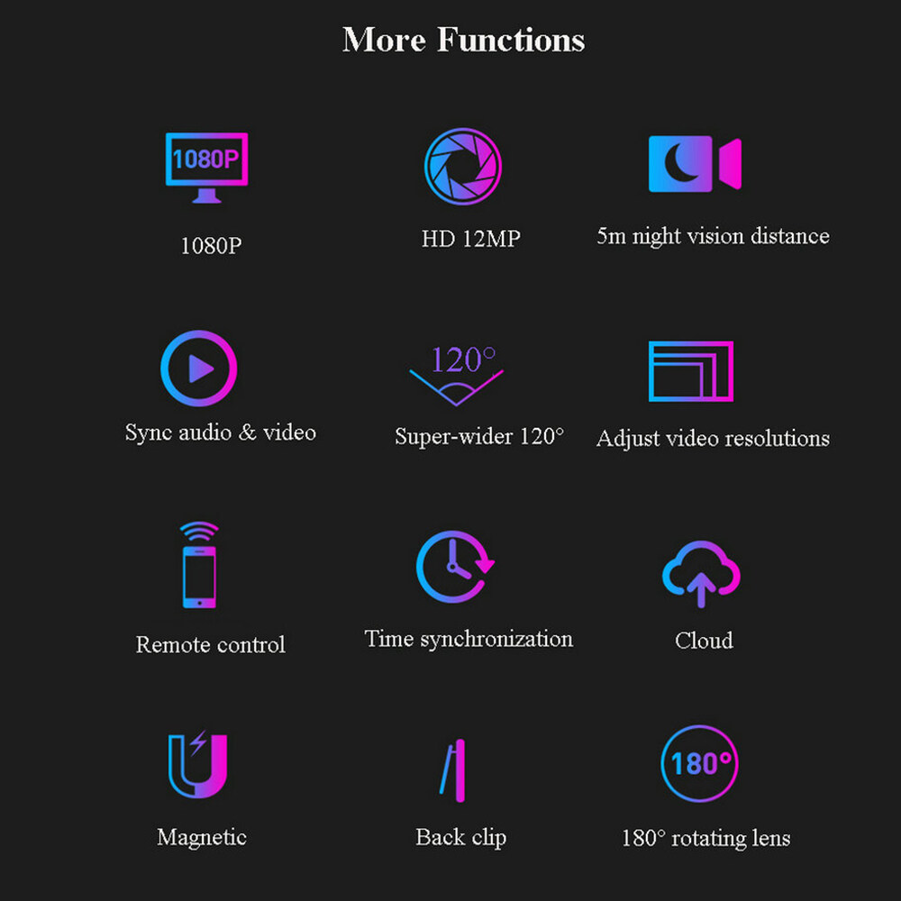 1. Shell made from plastic and anti-fall 2. One key to start recording 3. 4pcs 940 red infrared lights 4. Recording and charging simutaneously. 5. Loop recording 6. Motion Detection, HD 1080P, WIFI camera 7. Car driving recorder, Sports DV, Law enforcement instrument 8. Support TF card of 8GB to 128GB 9. 180-degree rotating camera heads and Super wider angle of 120 degrees 10. Synchronize system time 11. Strong magnetic adsorption 12. Long Recording Time after fully charged 13. Support wifi, router, hotspots, remote control and connect to cellphone directly 14. Long battery life: 7 hours continuous recording time when turning off WIFI. 5 hours continuous recording when turning on WIFI 15. Password protection 16. Smart moblie phone alarm. 17. SMS alarm 18. Invisible and silent Recording 19. Playback software: QQPlayer/Kmplayer/VLCmedia 20. Functions: Support cellphone/computer/tablet/ remote control/ monitor/ record/ screenshot 21. Other auxiliary functions: Infrared light/LED indicator/Back clip 22. Color: Black