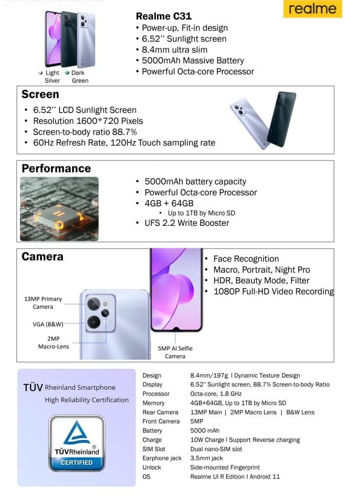 Specification: Realme C31Brand New Sealed Set 2 Years Realme Warranty ⭐4GB RAM 64GB ROM⭐Display 6.5" Minip-drop Fullscreen⭐Battery 5000 mah⭐Main Camera 13MP+2MP+0.3MP⭐Front Camera 5MP⭐Rear Fingerprint Unlock