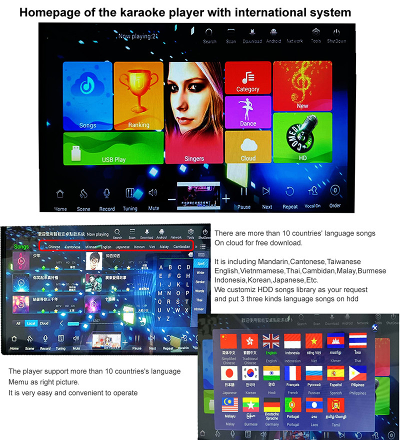 5.Songs quantity: Chinese English songs preloaded for directly karaoke singing.More than 10 countries songs on cloud for free download
