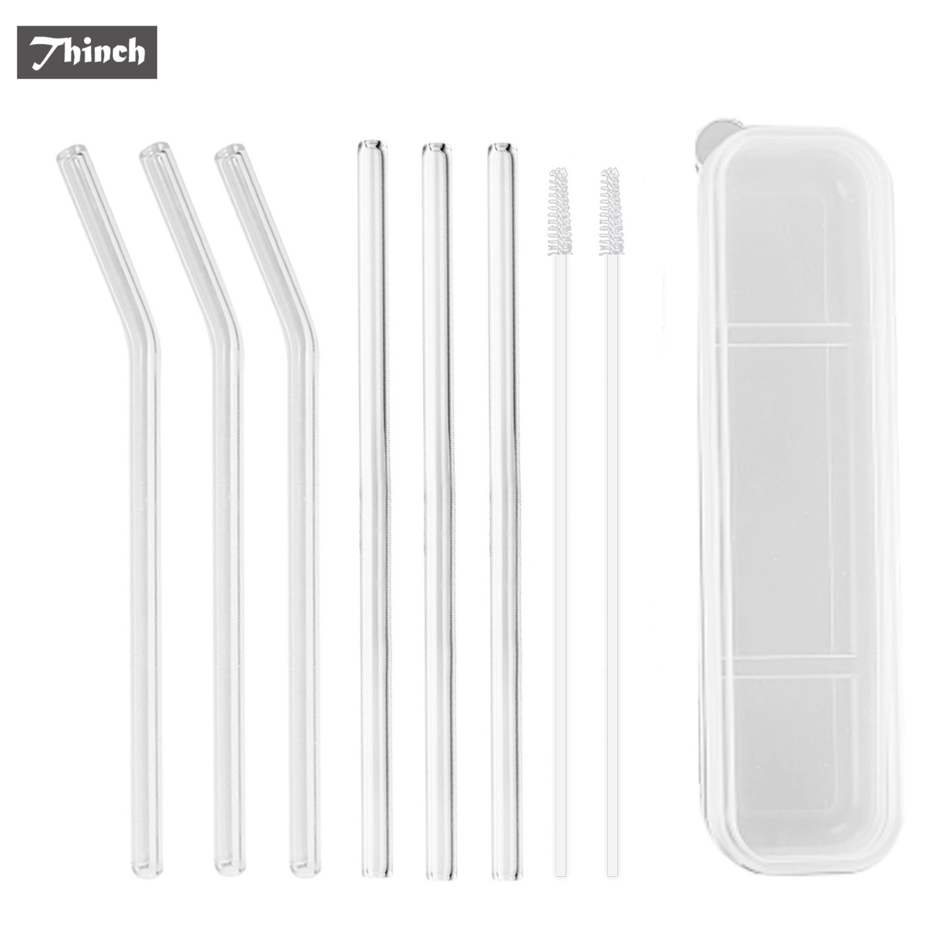 3pcs Reusable Clear Straight Drinking Glass Straws + 3pcs Bent Straws + 2pcs Cleaning Brush + Storage Box for Cold Bevarage Cocktail Coffee 180 x 8 mm