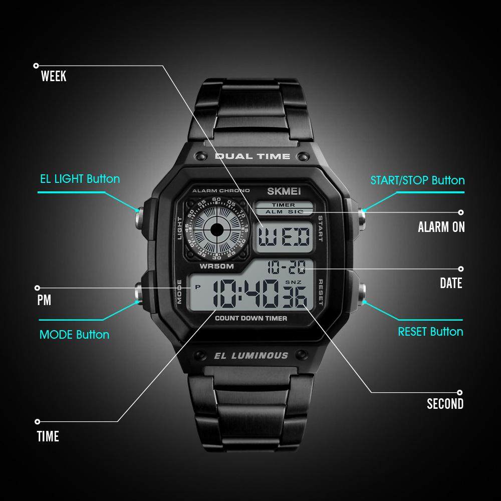 Features: Alarm Snooze / 50m Water Resistant / Auto Calendar / 24 Hour Countdown / SPL Stopwatch / EL Backlight / Shock-Resistant / Week / Year / 12/24 Hours / Dual Time Zone / Hourly Chime