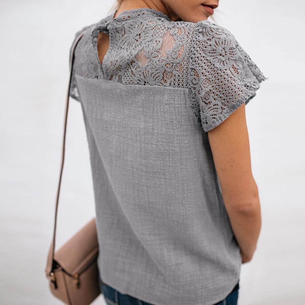 Womens Lace Patchwork Flare Ruffles Short Sleeve Cute Cotton Shirt Blouse Top